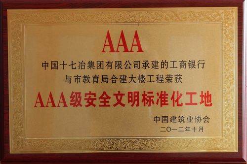近日,由中国十七冶集团市政工程技术公司承建的马鞍山市工商银行与市教育局合建大楼工程荣获由中国建筑业协会颁发的安全文明施工最高奖项——国家“AAA级安全文明标准化工地”荣誉称号。这也是马鞍山市2012年唯一获得此奖项的工程。