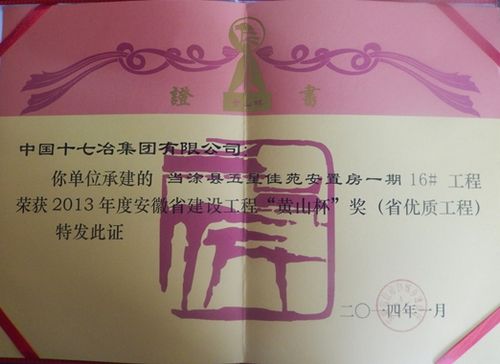 2013年度安徽省建筑工程“黄山杯”优质工程奖日前揭晓,中国十七冶集团承建的当涂县五星佳苑安置房一期16#楼工程、马钢动车组车轮用钢生产线工程、马鞍山太白大道(九华路—采石河路)道路工程改造二标段获此殊荣。