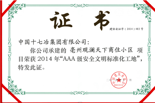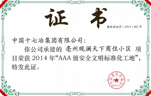 日前,由中国十七冶集团房屋工程技术公司承建的亳州国文观澜天下商住小区工程喜获中国建筑业协会2014年“AAA级安全文明标准化工地”荣誉称号。