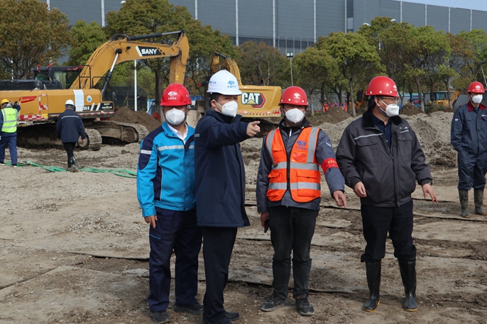 当天下午,在嘉定凤凰光学方舱,刘安义总经理查看了现场的施工进度、物资供应、疫情防控等工作整体情况,对项目建设所取得的各项成果和初步完工给予充分肯定,高度赞扬了项目团队“越是艰险险阻越向前”的奋勇攻坚精神和鏖战“四天四夜”超常拼搏的非常担当。刘安义总经理表示,全体参建人员拿出了“开始即是决战、起步就是冲刺”的精神气概,卯足干劲、全力以赴,克服暴雨恶劣天气、工期迫在眉睫、高强度连续作战等“极限挑战”,始终坚持“任务不减、标准不降、目标不变”,齐心协力推进项目如期履约。在接下来的工作中,要继续加强协同配合、现场物资供应,做好对员工的关心关爱和后勤保障工作,严格落实“每日一核酸一抗元”制度,慎终如始强化疫情防控工作,全力推进项目竣工交付,高效完成各项任务目标。