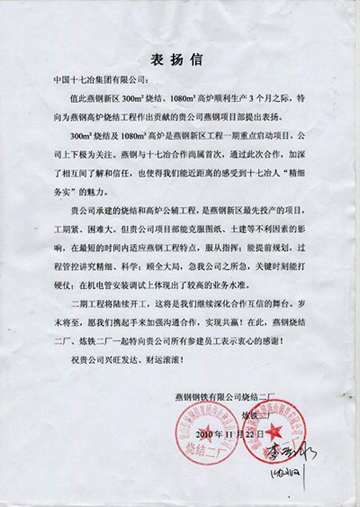 信中称赞十七冶项目部能克服不利因素的影响,在最短的时间内适应燕钢工程特点,服从指挥,顾全大局,急燕钢之所急,关键时刻能打硬仗,体现了较高的业务水准。信中说,十七冶与燕钢合作尚属首次,通过此次合作,加深了相互间了解和信任,使燕钢近距离地感受到十七冶人“精细务实”的魅力。