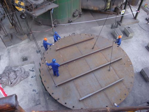 621,甘肃分公司承建的榆钢公司热风炉工程顺利完成第一带炉底板吊装。