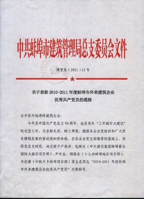 在党的生日到来之际,蚌埠市建管局党总支通报表彰了20102011年度蚌埠市外来建筑企业5名优秀共产党员,城建工程技术公司蚌埠项目部党支部书记尹开金和副经理胡维东被授予“优秀共产党员”称号。