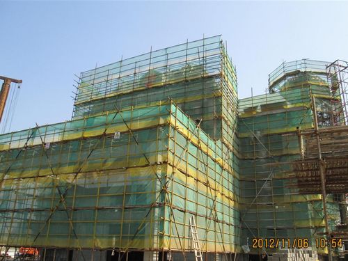 金浩•仁和天地一期工程总建筑面积125101.32m2,地库总面积25000m2,包括9栋高层住宅和1座售楼部。售楼部为框架结构三层,局部六层,主厅高度8.4m,斜屋面顶坡度近60度,造型复杂。按照业主售楼部必须在11月7日交付装修的要求,项目部全体员工发扬了“高效严谨、精细务实”的企业作风,科学组织施工,从9月11日土方开挖到结构封顶,只用了不到两个月的时间。