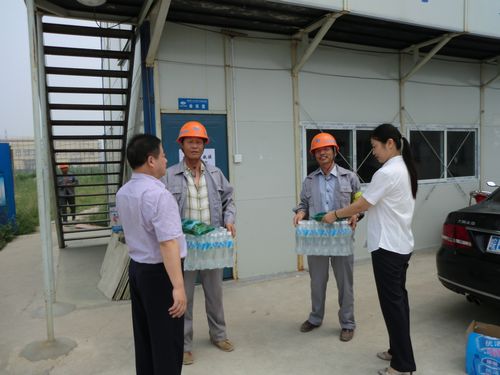 针对近期连日的高温天气,公司工会及时同在建的金山紫荆花、亭林两个项目部取得联系,购买了一定数量的茶叶、盐汽水、毛巾、风油精、人丹等物品,送到项目部员工手中。并察看了员工宿舍及生活环境,要求各项目部高温季节一定要关心好员工的生活,及时调整作息时间,改善他们的饮食结构,让大家吃好休息好。