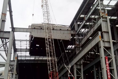 芜湖新兴铸管工程厂房延伸段GH跨屋面烟罩吊装完成