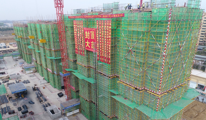 天长市新型城镇化提质升级补短板项目由产业培育设施配套用房建设工程、铜城镇产业培育设施建设工程和宿扬高速以西区域路网工程三个子项组成。产业培育设施配套用房建设工程总建面约83530.07平方米,包含11栋高层住宅楼、3栋商业建筑及室外附属配套。此次封顶单体为工程9#住宅楼,地下2层、地上11层,建筑高度32.5米,抗震设防烈度为7度,结构形式为框架剪力墙结构。