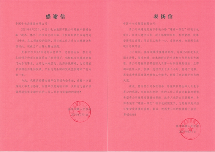 近日,恩施市盛家坝镇人民政府向中国十七冶集团致感谢信和表扬信,对公路工程技术分公司恩施市普通公路“建养一体化”01项目部表示感谢和表扬。