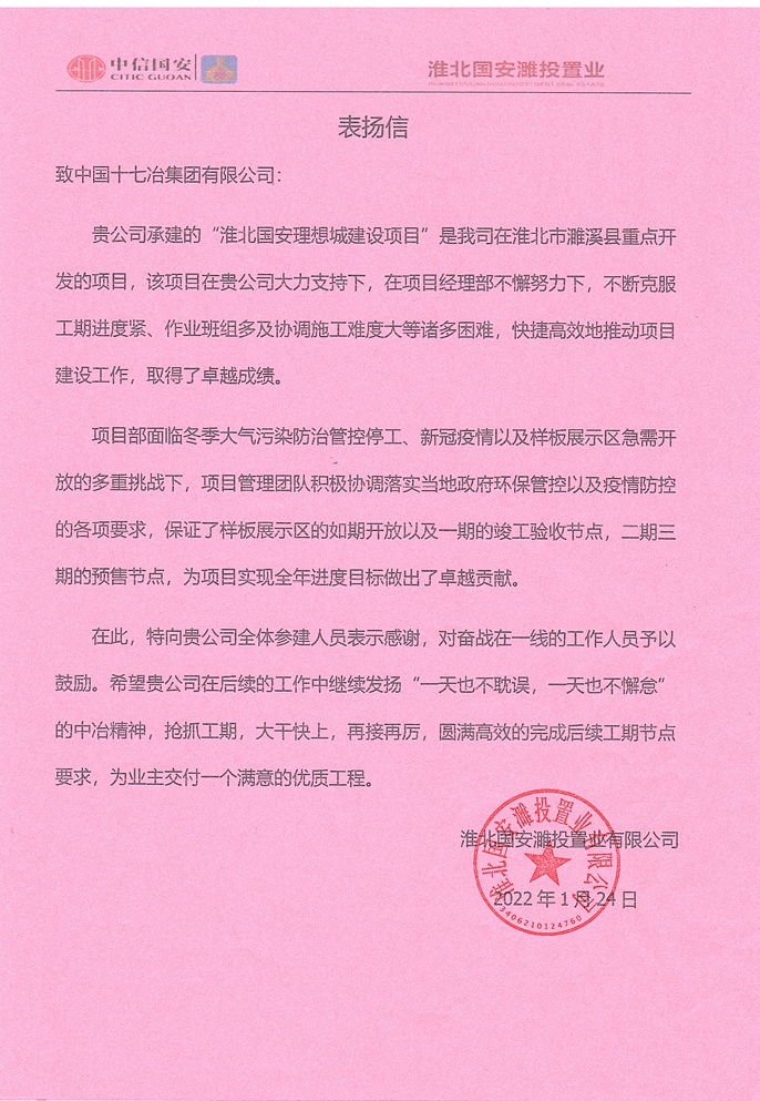 近日,淮北国安濉投置业有限公司向中国十七冶集团有限公司送来表扬信,对市政工程技术分公司淮北国安理想城项目经理部精益求精、井然有序的管理工作给予高度的肯定。