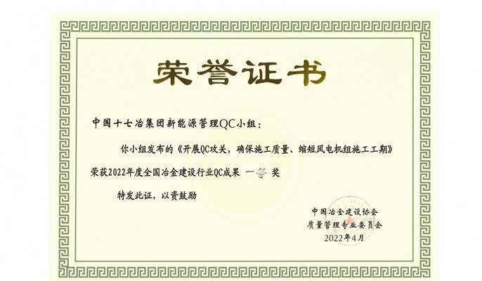 中国十七冶集团新能源管理QC小组发布的《开展QC攻关,确保施工质量、缩短风电机组施工工期》和泗县民利路、洼张山路及宁河路道路建设EPC项目经理部QC小组发布的《提高桥梁构件钢筋骨架冷弯成型及安装效率与质量》荣获2022年度全国冶金建设行业QC成果一等奖,南京农业大学江北新校区项目“拼搏”QC小组、北京古月佳园置换房项目QC小组等12个QC小组成果荣获二等奖。