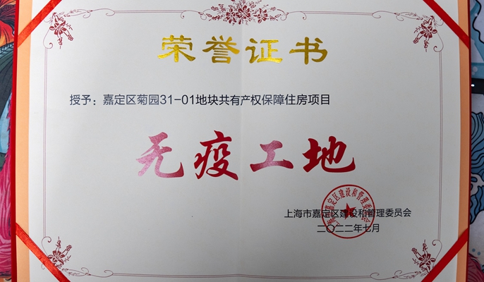 7月7日,由中国十七冶集团上海分公司承建的嘉定区菊园31-01地块共有产权房项目荣获嘉定区建设和管理委员会“无疫工地”称号。