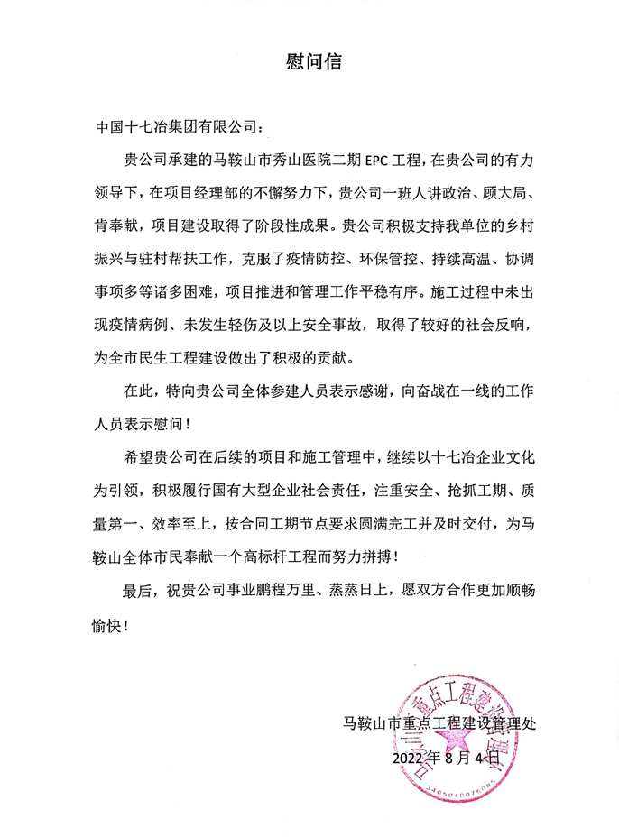 信中对秀山医院二期在建设过程中未出现疫情病例、没有发生一起安全事故表示赞扬,并对项目部提出殷切希望,希望项目部在今后的施工和项目管理中,坚持以十七冶企业文化为引领,积极履行国有大型企业社会责任,注重安全、抢抓工期、质量第一、不忘初心,将秀山医院二期项目打造成马鞍山市标杆工程。