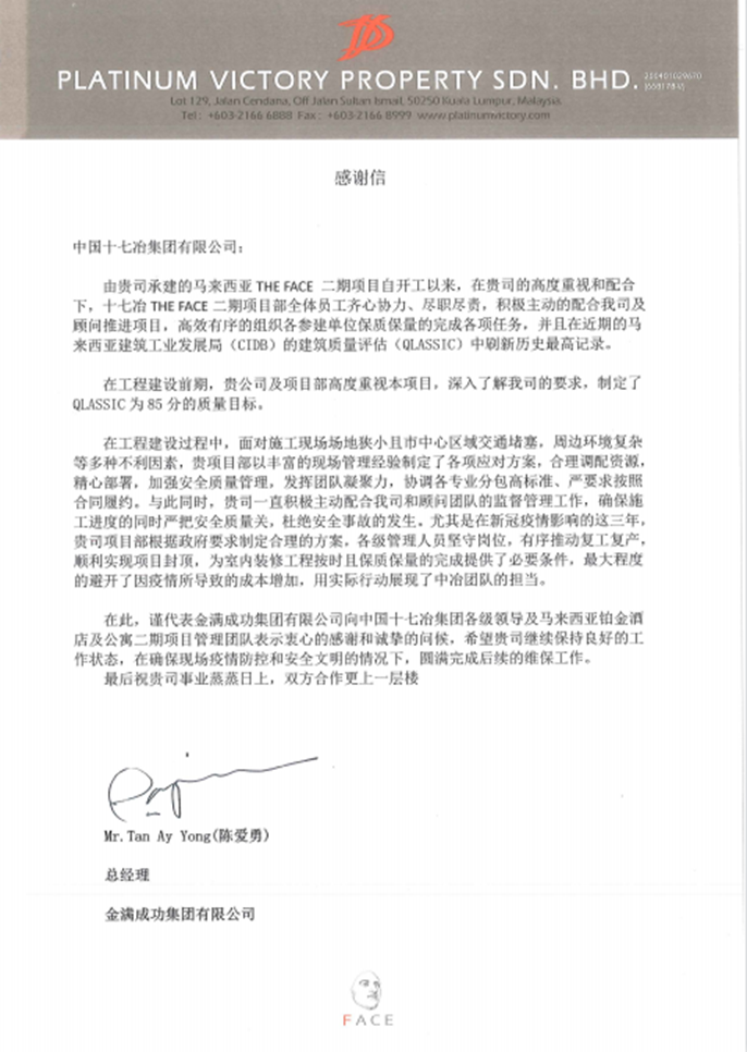 10月20日,中国十七冶集团收到金满成功集团有限公司发来感谢信,对房屋工程技术分公司承建的马来西亚THE FACE铂金酒店及公寓二期项目在马来西亚建筑工业发展局(CIDB)的建筑质量评估(QLASSIC)中刷新历史最高记录,取得89分的高分表示感谢,并给予高度赞扬。