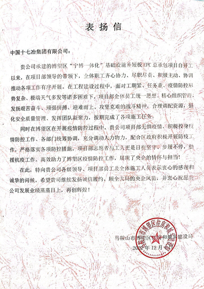 表扬信指出,项目开工以来,在项目部领导的带领下,全体职工齐心协力、尽职尽责、积极主动、协调推动各项工作有序开展。在工程建设过程中,面对工期紧、任务重、疫情防控形势复杂、极端天气多发等诸多困难,项目部全体员工统一思想、精心组织管理,发扬艰苦奋斗顽强拼搏、迎难而上、攻坚克难的战斗精神,合理调配资源,强化安全质量管理,发挥团队凝聚力,按期完成了各项施工任务。同时在博望区开展疫情防控过程中,项目部无惧疫情,积极投身疫情防控工作,各部门统筹协调,充分调动人力物力,配合区政府积极开展防疫工作,严格落实各项防控措施。项目部志愿者与工入更是日夜坚守、步履不停,驰援抗疫工作。高效助力了博望区疫情防控工作,展现了央企的情怀与担当。