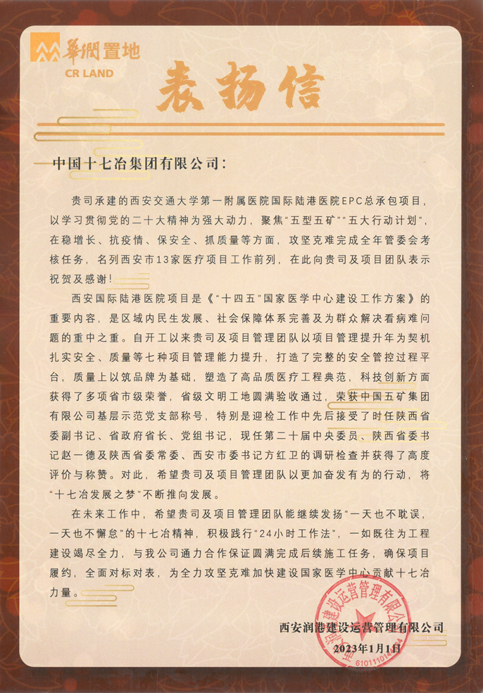 近日,华润置地西安润港建设运营管理有限公司向中国十七冶致表扬信,对陕西分公司西安交通大学第一附属医院国际陆港医院项目部攻坚克难完成全年考核任务、取得各项荣誉提出表扬并给予高度肯定。