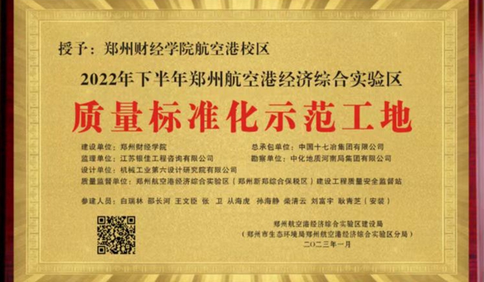 2月21日上午,从郑州航空港经济综合实验区建设局获悉,中国十七冶承建的郑州财经学院航空港校区项目以专家验收总分综合排名第一的优异成绩,获评“2022年下半年郑州航空港经济综合试验区质量标准化示范工地”,同时成为郑州航空港区唯一被推荐参评河南省住建厅质量标化工地的房建项目。