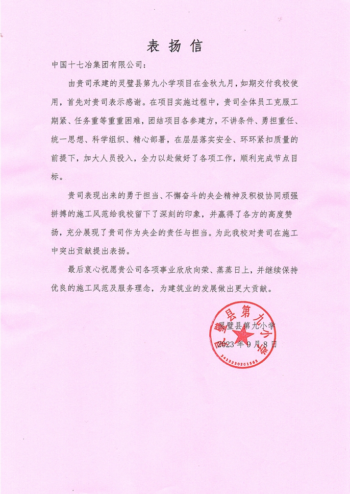 近日,灵璧县第九小学、第十小学分别向中国十七冶集团致表扬信与感谢信,对建安分公司灵璧小学项目部按期完成各项施工任务,保障学校如期开学表示感谢。