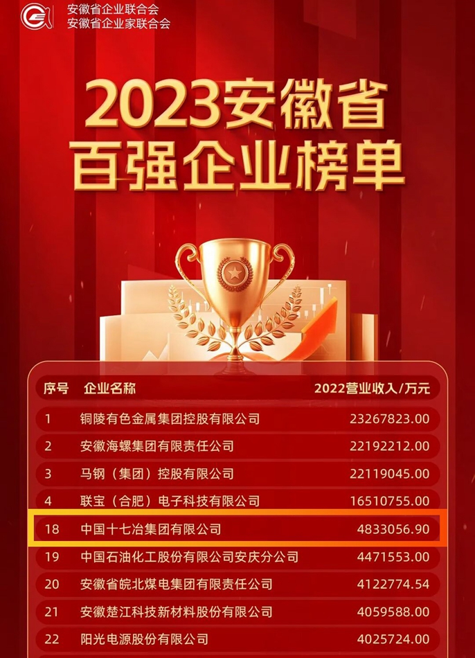 11月22日下午,安徽省企业联合会、省企业家联合会发布2023安徽省百强企业榜单,中国十七冶集团再进两位,居安徽省百强企业第18位。