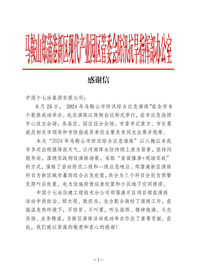 7月9日,马鞍山郑蒲港新区管委会防汛抗旱指挥部办公室向中国十七冶集团致表扬信,对住建分公司郑蒲港片区项目部全力配合“2024年马鞍山市防汛综合应急演练—郑蒲港演练科目”予以肯定。
