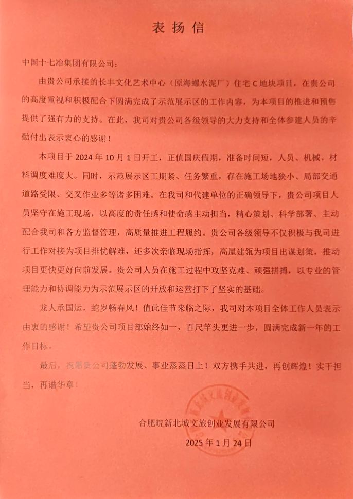 1月24日,合肥皖新北城文旅创业发展有限公司向中国十七冶集团致表扬信,对城建分公司长丰文化艺术中心片区城市更新(原海螺水泥厂)项目部在过去一年里抢抓实干,确保项目高品质履约表示感谢。