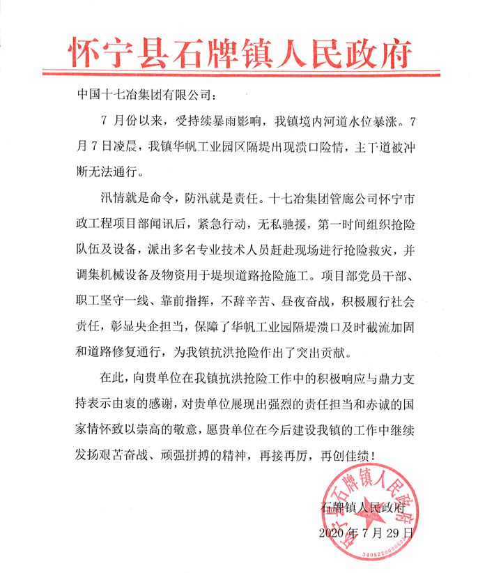 感谢信指出,7月份以来,受持续暴雨影响,石牌镇境内河道水位暴涨。7月7日凌晨,镇华帆工业园区隔堤出现溃口险情,主干道被冲断无法通行。中国十七冶怀宁市政工程项目部闻讯后,紧急行动,无私驰援,第一时间组织抢险队伍及设备,并派出多名专业技术人员赶赴现场进行抢险救灾。项目党员干部、职工坚守一线、靠前指挥,不辞辛苦、昼夜奋战,积极履行社会责任,彰显央企担当,为石牌镇抗洪抢险作出了突出贡献。