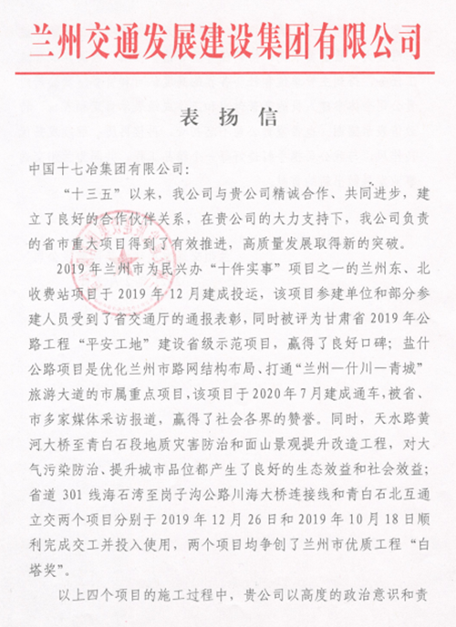 表扬信中写道,兰州东、北收费站项目,盐什公路项目,省道301项目和青白石互通项目在施工过程中,十七冶以高度的政治意识和责任意识,迎难而上、勇于担当、积极作为,克服项目工期紧、施工难度大、质量要求高、协调任务重等诸多困难,圆满完成了施工任务,得到主管单位和社会各界的高度认可和赞誉。