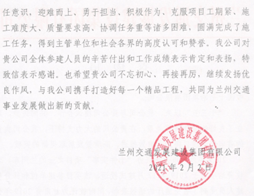 2月2日,兰州交通发展建设集团有限公司向中国十七冶集团有限公司发来表扬信,对十七冶公路分公司承建兰州四个项目的突出表现给予肯定与表扬。