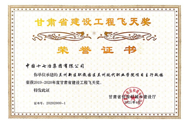6月17日,中国十七冶集团甘肃分公司承建的兰州新区职教园区兰州现代职业学院项目主行政楼工程荣获2019-2020年度甘肃省建设工程飞天奖。