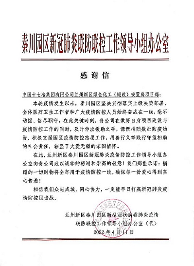 4月11日,兰州新区秦川园区新型冠状病毒肺炎疫情联防联控工作领导小组办公室向中国十七冶集团甘肃分公司兰州新区绿色化工(棚改)安置房项目经理部致感谢信,对项目部在兰州新区疫情防控最严峻时刻捐赠防疫应急物品及提供志愿服务表达感谢。