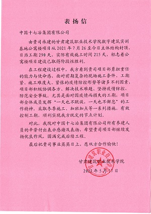 5月17日,甘肃建筑职业技术学院向中国十七冶集团有限公司致表扬信,对中国十七冶集团甘肃分公司承建的甘肃建院公寓楼EPC工程总承包项目部高效推进项目建设,取得1#公寓楼主体结构封顶阶段性胜利表示感谢。