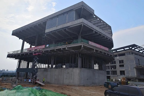 智能应急制造产业园项目位于河南省鹤壁市淇滨区葫芦套村,总建筑面积133237平方米,其中地上建筑面积约114501平方米,地下建筑面积约18736平方米,包括配套设施在内共计7个单体,7#、11#、12#楼主体结构及二次结构施工完,正在进行幕墙及装饰装修施工。9#、10# 楼五层和四层主体施工,6#、8#楼 主体施工中。7#楼建筑面积4003平方米,建筑总高为19.3米,共两层,一层、二层局部设有夹层,二层通过连廊与8#、12#楼连接,结构形式为钢结构,整体呈六边形造型,屋面设有外悬挑造型,外墙采用玻璃幕墙,造型独特,尽显“汉唐”风格。
