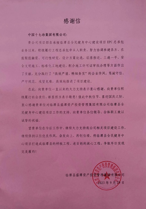 信中指出,十七冶自承接临潭县全民健身中心建设项目EPC总承包业务以来,积极履行工程总承包职责,努力协调参建各方,在前期投融资、可行性研究、设计方案比选,旧房拆迁、三通一平、安全文明施工、标准化工地建设,配合施工许可证审批办理等方面作出了贡献,充分践行了“高效严谨、精细务实”的企业作风,高效地推进了项目建设。